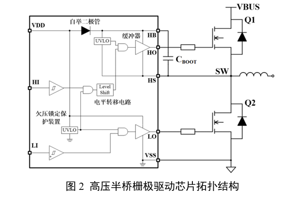 - 自举二极管:在下管Q2导通时对自举电容进行充电。通过电平转换电路,使相对于地(VSS)的HI信号转换为同步的相对于悬浮地(HS)的HO信号,从而控制上管Q1的开关;