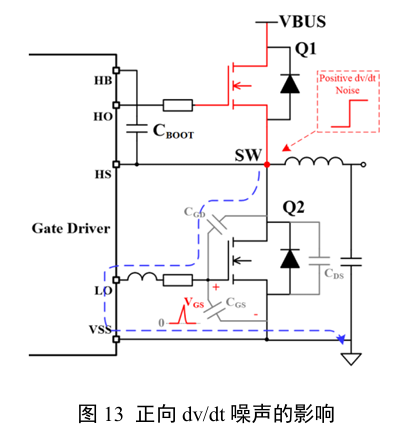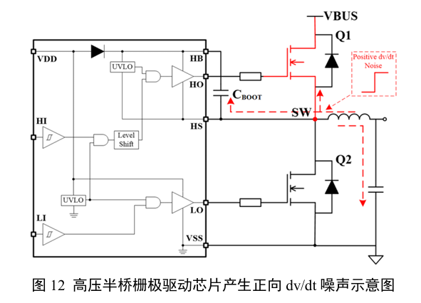 当下管Q2关断,上管Q1导通时,电流经过上管流过负载电感及电容,此时HS引脚处产生的电压从0V升至VBUS,即产生正向dv/dt噪声,如图12所示。