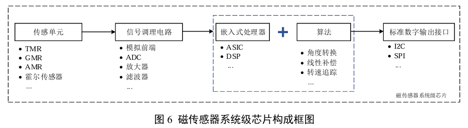 系统级芯片在单磁头级敏感单元的基础上,通过半导体工艺将完整的信号处理链与智能功能集成于单一封装内,构成一个功能完备的微型测量系统。该类芯片内部融合高精度传感单元(如XMR)、信号调理电路、嵌入式处理器及智能算法、标准输出接口(架构如图6所示),能够直接输出经过放大、线性化、温度补偿后的稳定模拟信号或通过I²C、SPI等标准接口输出的数字信号。