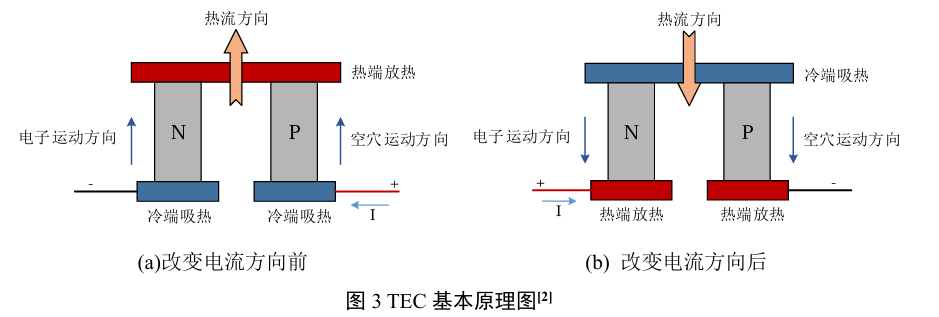 - 绿框部分为TEC元件。TEC是利用电子跃迁能量的主动式热交换器件(主动热泵),热交换方向可以通过改变载流子运动方向而改变(即可以改变偏置方向来翻转冷热端交换极性),基本原理如图3所示。