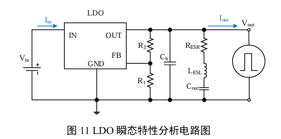 采用图11的电路来分析LDO的瞬态特性。为便于分析,在LDO的输出端施加一个从0阶跃到最大输出电流,再从最大输出电流阶跃至0的负载电流值。