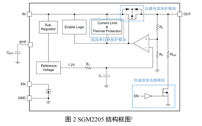 上述LDO典型结构是实现稳压功能的基础,但在实际复杂的应用环境中需确保自身和后续负载电路的安全可靠运行,LDO 通常集成了多种重要的保护功能模块。图 2 为圣邦微电子公司的SGM2205[1]内部结构图,其集成了限流保护、过热保护、反灌电流保护、快速放电电路等模块。