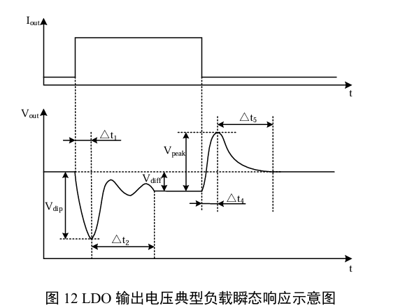 图12展示了负载电流出现阶跃后的输出电压响应示意图。由图12可见,如果负载电流Iout有一个从小到大的阶跃,输出电压会产生一个大的跌落,在△t1时间内降低Vdip。之后输出电压开始趋向于平衡状态,经过△t2时间后,输出电压达到稳定的平衡状态,此时的输出电压比轻载情况的输出电压低Vdiff(由负载调整率引入)。如果负载电流出现一个从高到低的阶跃,输出电压会产生一个大的峰值,在△t4时间内上升Vpeak。之后输出电压开始趋向于平衡状态,经过△t5时间后,输出电压达到稳定的平衡状态,此时的输出电压比重负载情况的输出电压高Vdiff。若对其进行定量分析,则有: