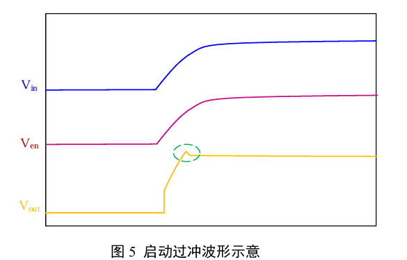 图3中LDO的EN端通过上拉电阻和Vin连在一起,Vin从0开始缓慢上升。当Ven上升到大于 Vih 时,Vout开始有输出(如图4中红色虚线标记)。此时Vin小于Vout_nom+Vdrop,LDO工作在压差区, Vout 以 Vdrop的压差跟随Vin上升,环路不起作用。当Vin上升到大于Vout_nom+Vdrop时,环路开始调节输出稳压至设定值。但环路响应需要一定时间,此过程中Vout仍会跟随Vin上升,因此表现为产生输出过冲。出现启动过冲的波形示意如图5所示。