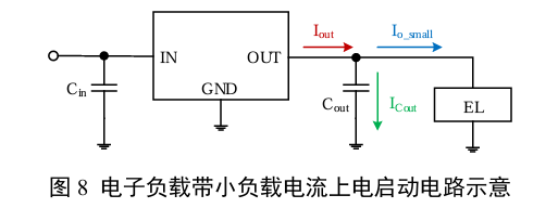 - 当电子负载(EL)带小负载电流(记为Io_small)上电启动时,LDO最大输出电流Iout_max>Io_small,参考图8,假设Iout_max=50mA,Io_small=10mA,则最多有 40mA 的输出电流可用于给Cout充电,因此可以正常建立Vout。