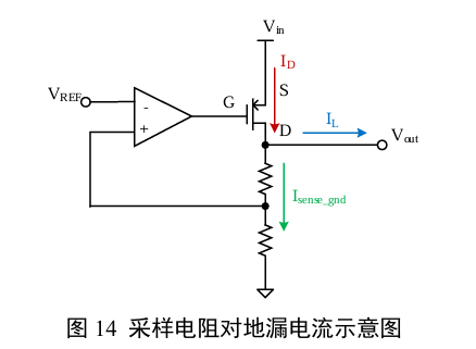 式(7)中,Rds≈1/λID,λ 为 PMOS调整管的沟长调制系数,ID为PMOS调整管的漏电流。注意ID不等同于负载电流IL,还包括了采样电阻的对地漏电流 Isense_gnd,即 ID=IL+Isense_gnd,如图 14 所示。 通常规格书中会给出 Isense_gnd 的最小值,用以限定空载时主极点的最小值,保证最小系统环路带宽以保证稳定性。