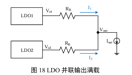 - 由于同一型号的不同样品之间的精度存在个体差异,因此 Vo1一般不会完全等于 Vo2,即 (Vo1-Vo2)≠0,故 RB≠0。可见两个平衡电阻RB是必须存在的。如果没有两个RB,那么将会通过Vo1(2) 到Vout 之间导线的寄生电阻来充当RB的功能,但是该寄生电阻非常小,这将导致(I1-I2)会非常大,即其中一颗LDO的输出电流远大于另外一颗。这可能导致电流较大的那颗LDO因为功耗过大而触发过热保护。