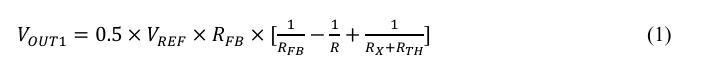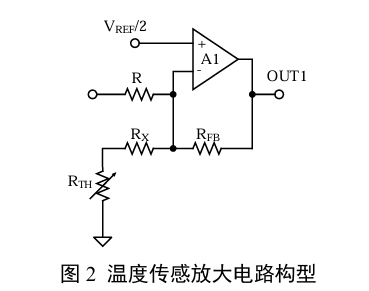 图2为温度传感放大电路构型,根据公式(1)可推出:其增益随RFB增加而增加,随R增加而减小。若需减小补偿网络增益,即减小温度传感电路输出增益,则可通过减小温度传感放大电路的RFB获得。
