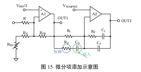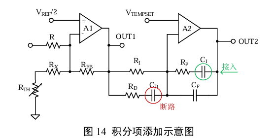 将RD短路,接入一个远小于CI的电容CD。逐渐增大CD容量,直至OUT2出现震荡(临界)。此时,可通过减小CD或接入RD重新稳定电路。微分项增益与RD和CD大小成反比。