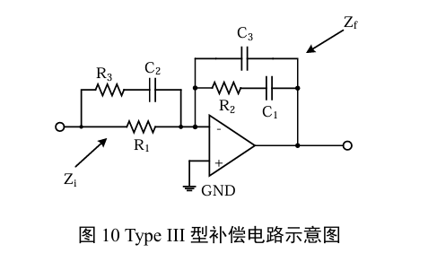 根据上述分析,补偿的传递函数需要具备一个低频极点、两个用于补偿带内极点的零点,以及至少一个接近穿越频率(fcross)的带外极点以控制相位裕度和增益裕度。Type III型[3]补偿电路最多可提供两个零点和三个极点,因此较为适用。