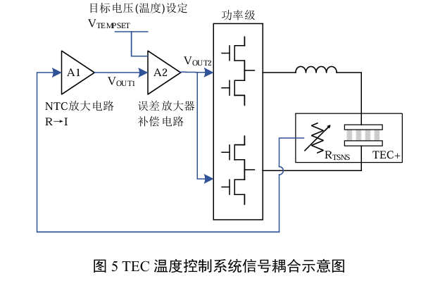 图1系统控制层面的组件简化后的信号耦合传递如图5所示。TEC和温度传感NTC通过被控器件进行热耦合,温度变化(如光电器件发热)是环路的外部扰动因素。