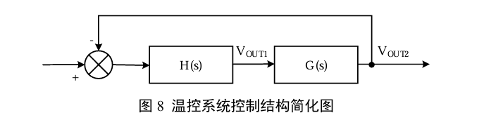 忽略热耦合与放大电路增益等细节,将橙色框内组件看作一个整体,其输入是误差放大器A2的输出VOUT2,输出是第一个测温放大器A1的输出VOUT1。该系统在工作范围内是一个单调的二端口网络,被控系统传递函数记为H(s),即TEC增益;误差放大器与补偿网络的传递函数记为G(s),整个TEC温控系统可简化为: