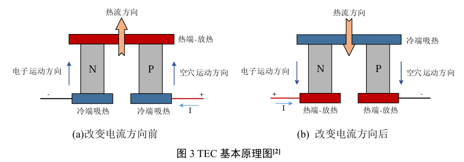 - 绿框部分为TEC元件。TEC是利电子跃迁能量的主动式热交换器件(主动热泵),热交换方向可以通过改变载流子运动方向而改变(即可以改变偏置方向来翻转冷热端交换极性),基本原理如图3所示。