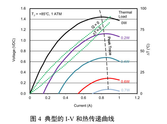 Tips:通常会控制TEC的工作状态,使其冷端降温与输入功率(电流)呈单调变化,即电流越大,搬运热量越多,冷端温度越低,制冷能力越强。制冷时TEC的主动热泵传导与电流成正比,而 TEC 内阻产生的发热与电流平方成正比,一味增加输入电流可能会导致发热超过制冷,使系统失去单调性。图4 是一个典型TEC 在不同热功率传递值下的 I-V 曲线。由图可知,在峰值轨迹(Peak Trace)之后以及更高电流处,驱动电压与ΔT(冷热端温差)的单调性会反转(如果输入功率无止尽的增加,图中更高电流处的曲线会下降回零直至零以下,此时整个系统的加热/制冷极性都会发生翻转),因此冷却电流必须小心限制在峰值轨迹以下,以保持驱动电流与产生的ΔT之间的单调关系。这对于稳定性和闭环收敛至关重要。