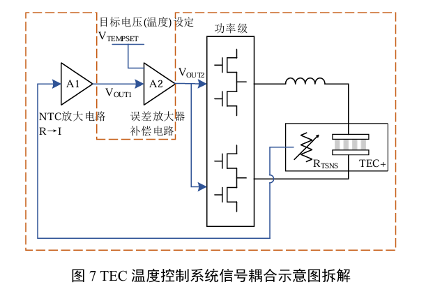 从环路单调性上,TEC输入功率上升必须导致NTC温度下降(VOUT1下降),整个负反馈的极性才能保证;如果监测到TEC输入功率上升,同时NTC温度也上升,证明这个热系统已经失控。下文将从热耦合机制和环路参数设定论述如何稳定热系统。