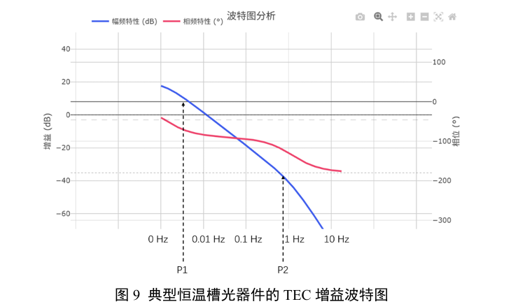 图9为一个典型恒温槽光器件的TEC增益波特图(同时能反映传递函数H(s)的特征根)。可见带宽内存在两个极点,一个在mHz级别,一个在Hz级别,一般设备难以精确测量。这样的双极点系统存在一个主要的问题:当系统增益被提升后,两个极点势必落在带宽内,在很低频处增益就会以-40db/dec的速率衰减,导致系统不稳定,而且穿越频率低,响应速度慢。